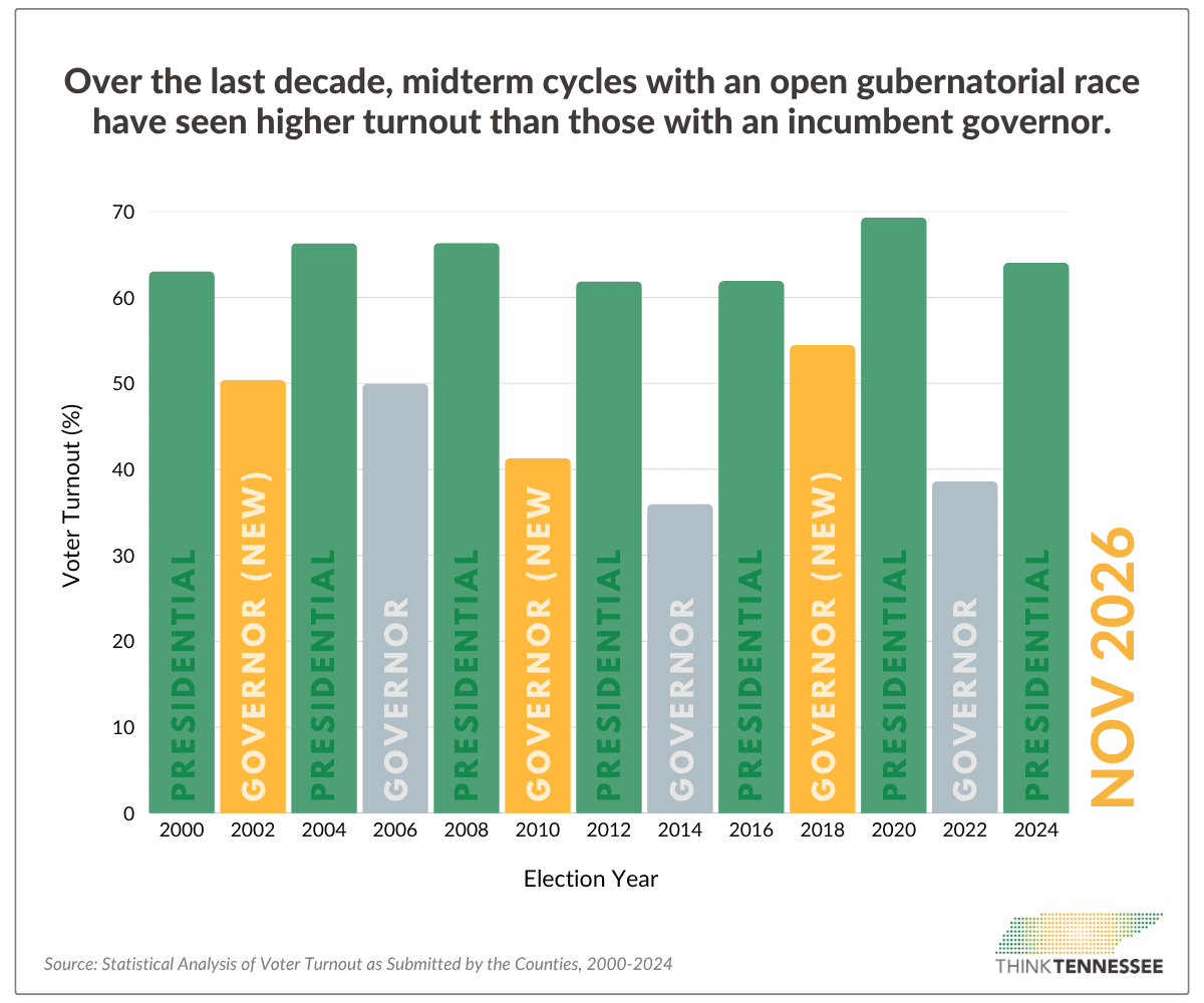 An Open Gubernatorial Race: Tennessee’s voter turnout trends show that presidential elections usually have higher voter participation than midterm cycles. However, when the governor’s seat is open, turnout tends to be higher than when we have an incumbent governor. With Governor Bill Lee term-limited, next year Tennesseans will elect a new governor.