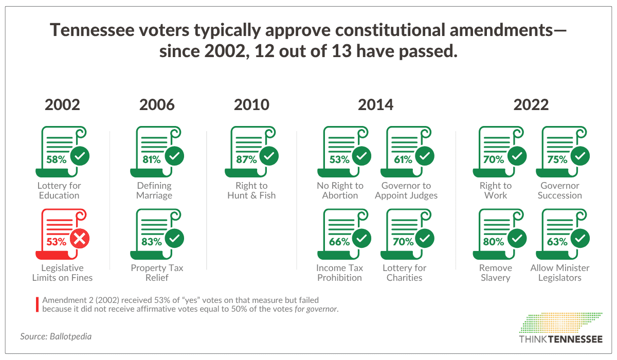 In the last few decades, nearly all constitutional amendment questions have been approved by Tennessee voters. Since 2002, just one out of 13 amendments failed—and even then, the measure received a majority of votes but just barely failed to meet the threshold 50% of votes cast for governor.[iii]